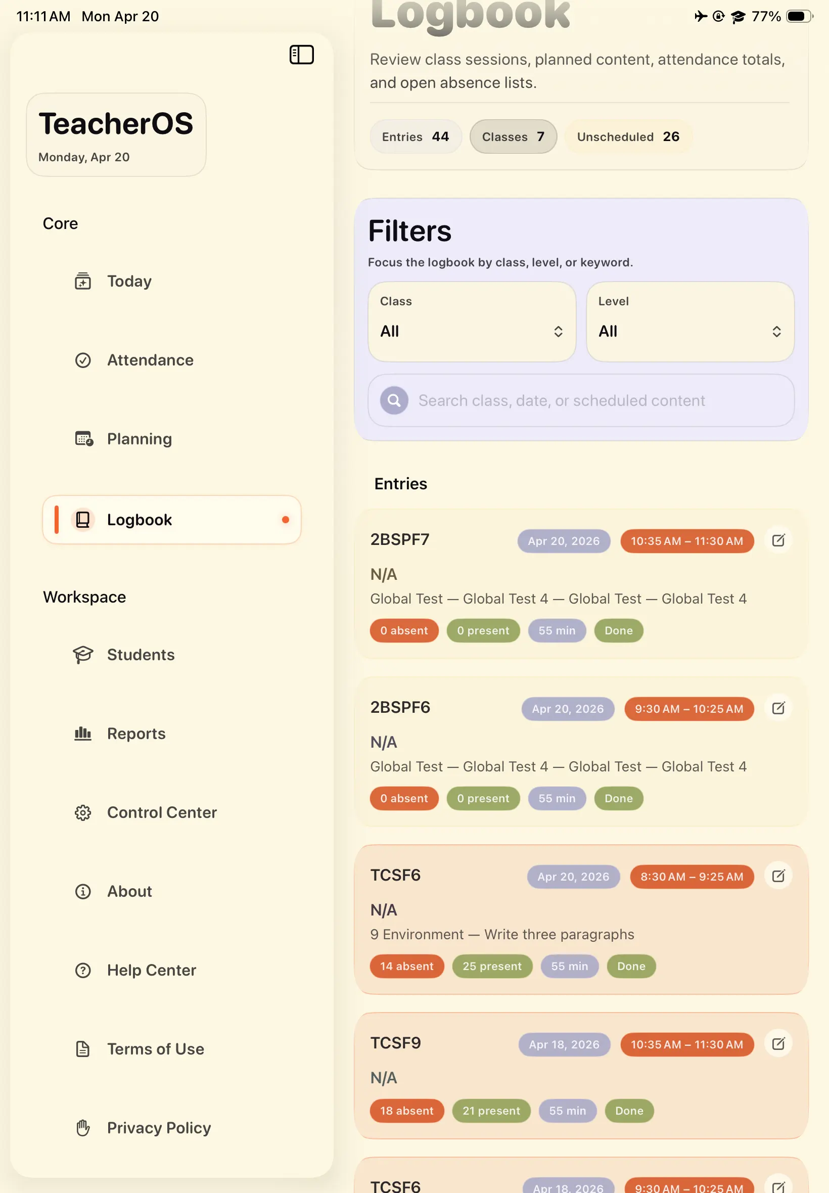 - Track completion (done / canceled classes)